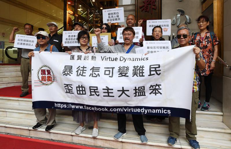 图:汇贤起动成员疾呼“暴徒怎可变难民”,要求德国政府立即重新审核黄台仰及李东升难民资格\大公报记者林良坚摄