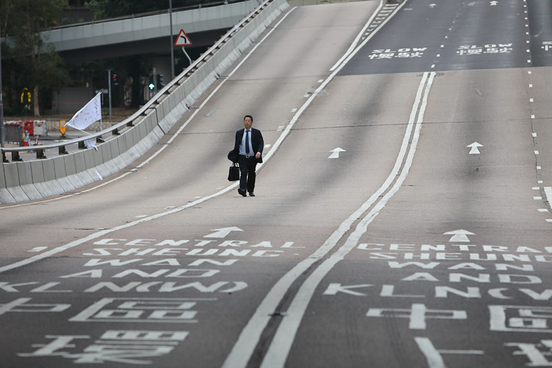 6月17日早间,受示威影响,金钟夏愨道主要干道一度封路,有上班族索性由中环往金钟方向循行车路步行到金钟上班。 香港中通社图片