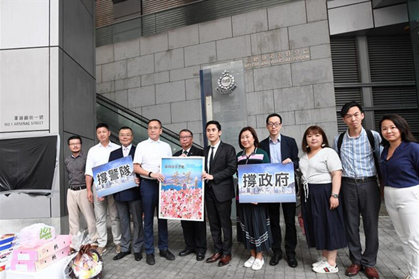 香港菁英会一眾成员则高举“撑警队,撑政府”的標语,並向警方代表送上带有支持者签名的爱心箱。