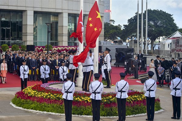 图为2018年7月1日香港特区政府举行庆祝回归21周年升旗仪式时,国旗和区旗在国歌声中冉冉升起。 香港中通社图片