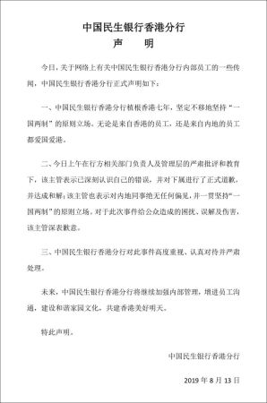 8月13日晚间,中国民生银行香港分行发布声明,声明內容如下: