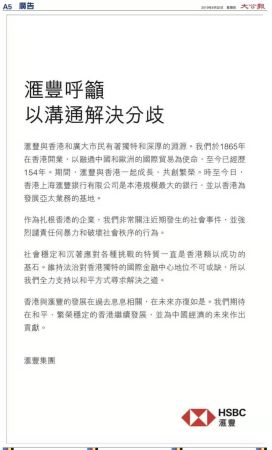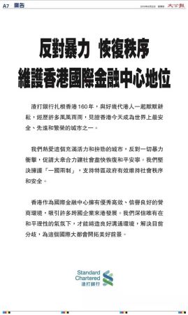 渣打银行的广告以“反对暴力,恢復秩序,维护香港国际金融中心地位”为题,称自己已在香港扎根160年,热爱香港这个充满活力和拼劲的城市,反对一切暴力衝击,促请大眾合力让社会尽快恢復和平安寧。坚决拥护“一国两制”,支持特区政府有效维持社会秩序和安全。