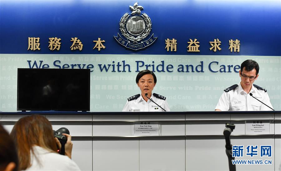 8月23日,香港特区政府警务处东九龙总区高级警司傅逸婷(左)在警方例行记者会上呼吁市民遵守机场临时禁制令,切勿以身试法。针对有网民煽动示威者阻塞往来机场的交通,再次妨碍机场运作,香港警方23日重申,机场临时禁制令已获延长,违令者可能触犯藐视法庭罪,市民切勿以身试法。新华社记者刘大伟摄